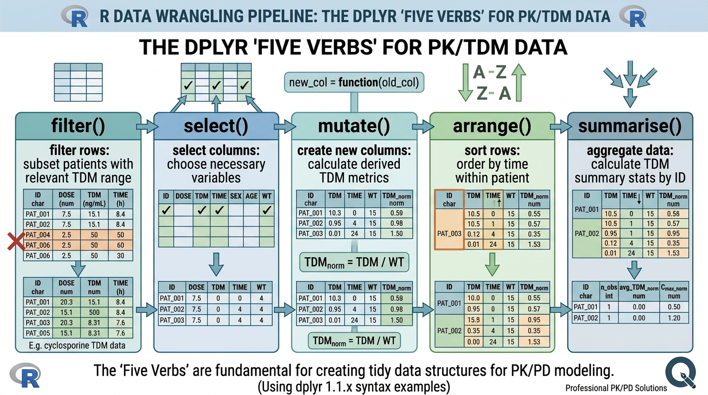 이전 장에서 R의 기본 객체 유형(벡터, 리스트, 데이터프레임 등)에 대해 학습했습니다. 이번 장에서는 이러한 객체들을 실제 약동학 데이터 분석에서 활용하는 방법을 배웁니다. 특히 tidyverse 패키지 생태계의 핵심인 dplyr을 중심으로, Cyclosporine 치료적 약물 모니터링(TDM) 데이터를 예제로 사용하여 데이터 조작의 기초를 다집니다.