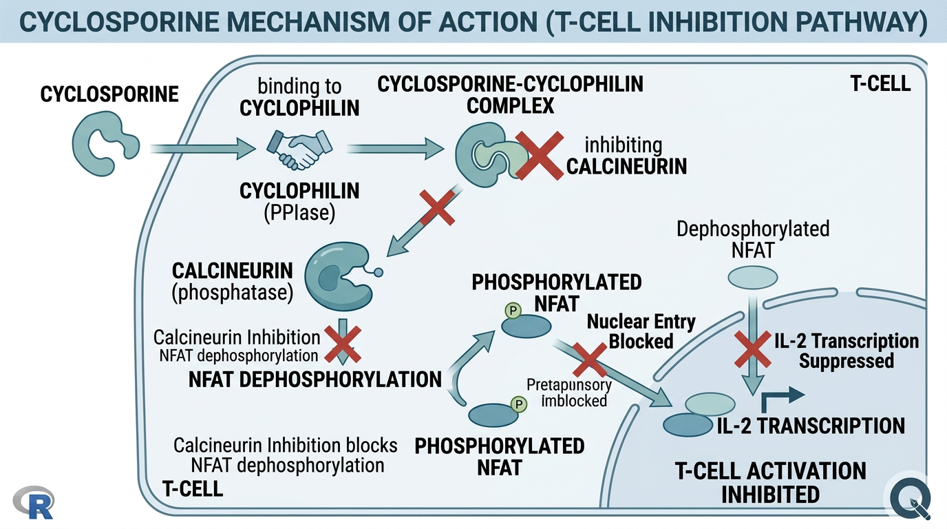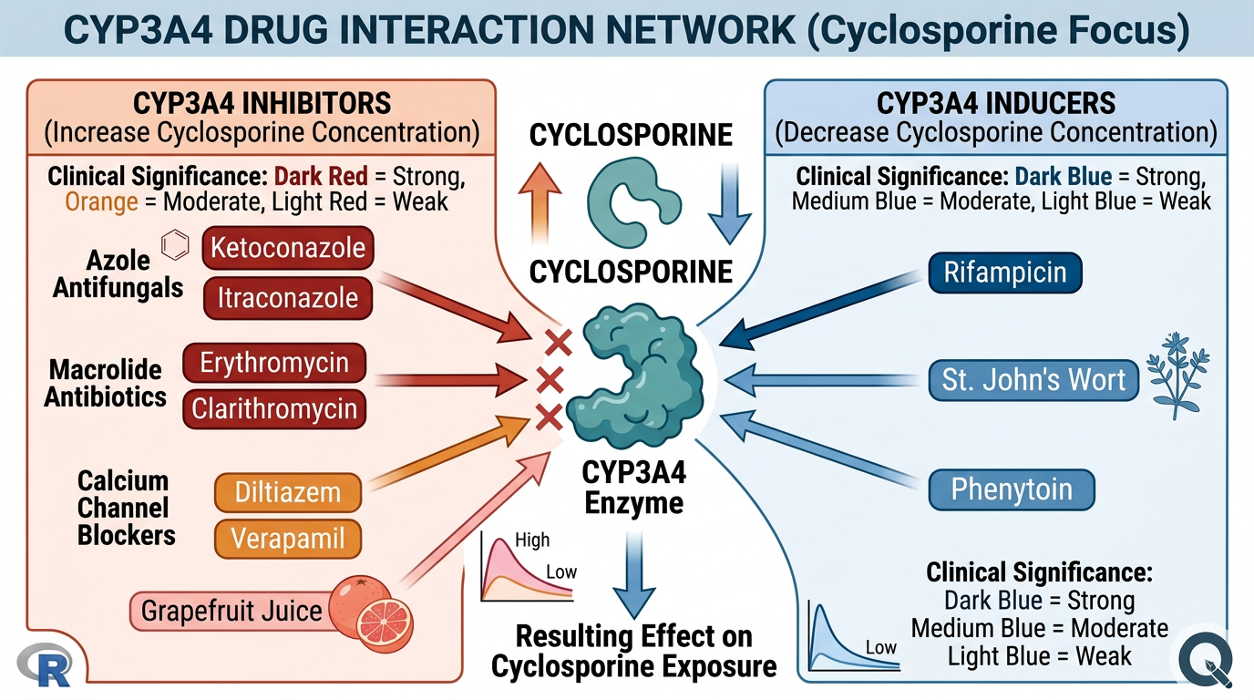 Cyclosporine은 칼시뉴린 억제제로, CYP3A4 대사와 좁은 치료역으로 인해 TDM이 필수적이며, C0 목표 범위는 100-200 ng/mL입니다.