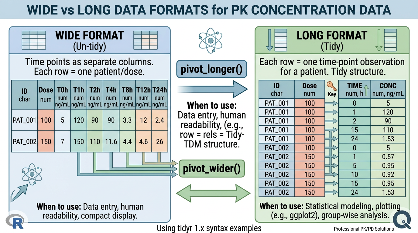 pk_long대부분의 PK 분석 도구(NONMEM, Phoenix WinNonlin 등)와 시각화(ggplot2)에서는 Long format을 요구합니다. 임상 현장에서 받는 데이터가 Wide format인 경우가 많으므로, pivot_longer()는 PK 데이터 전처리의 첫 단계로 매우 자주 사용됩니다.