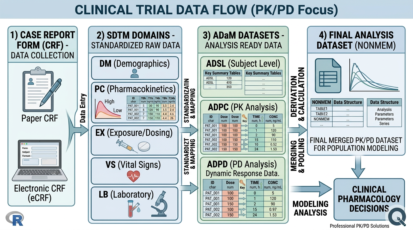 - PP (Pharmacokinetic Parameters): NCA 등으로 계산된 PK 파라미터를 저장합니다. Cmax, Tmax, AUC, t1/2 등의 도출된 파라미터가 포함됩니다.