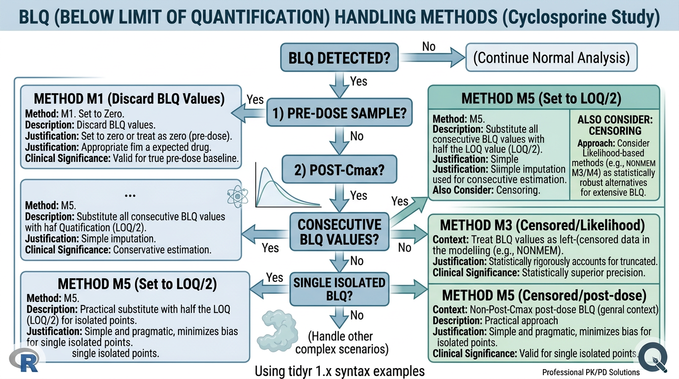 anti_join()으로 불일치를 확인하는 것이 중요합니다.BLQ 처리는 PK 분석의 중요한 전처리 단계이며, NCA에서는 M5 방법이, 모집단 PK에서는 M3/M7 방법이 권장됩니다.