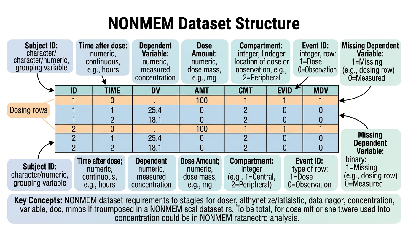 NONMEM 분석을 위해서는 특정 형식의 데이터셋이 필요하며, 이 형식은 NCA 분석에도 광범위하게 활용됩니다. 따라서 NONMEM 데이터셋 형식을 이해하는 것은 PK 데이터 분석의 기본입니다 (그림 7.1).