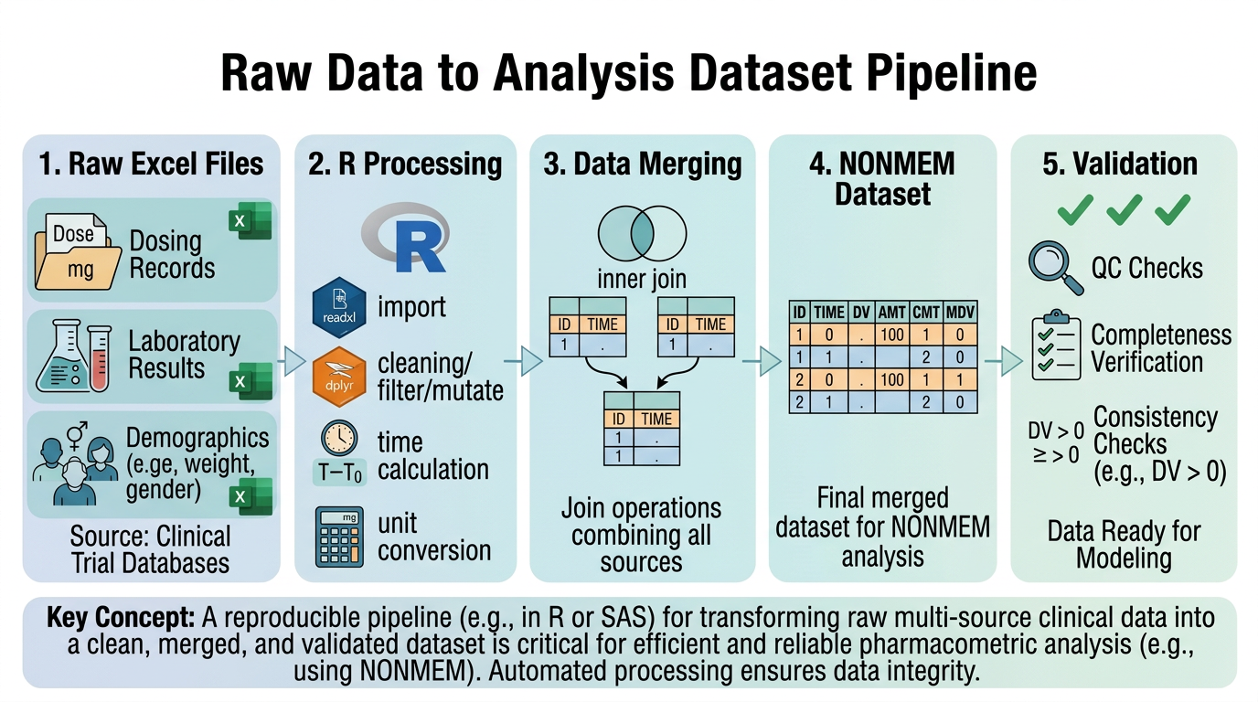 이 장에서는 임상시험에서 수집된 원시 데이터(raw data)를 약동학 분석에 사용할 수 있는 분석용 데이터셋(analysis-ready dataset)으로 변환하는 전 과정을 다룹니다. 특히 비구획분석(NCA)과 집단약동학(Population PK) 모델링에 사용되는 NONMEM 데이터셋 형식을 중심으로 학습합니다.