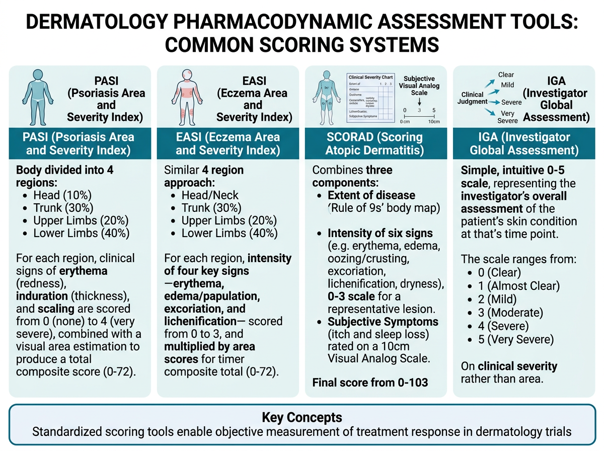 피부과 임상시험에서 PD 엔드포인트는 PASI, EASI, IGA 등 반주관적(semi-objective) 평가 도구에 크게 의존합니다. 이러한 평가 도구의 특성을 깊이 이해하고, 데이터의 특수성에 맞는 분석 전략을 수립하는 것은 신뢰할 수 있는 PK-PD 분석의 필수 전제입니다.