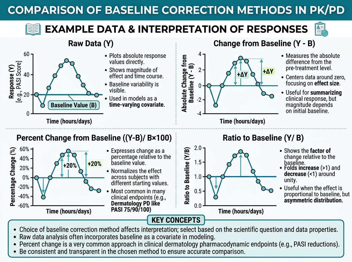 - PK-PD modeling: Ratio 또는 absolute change (모델 구조에 따라)