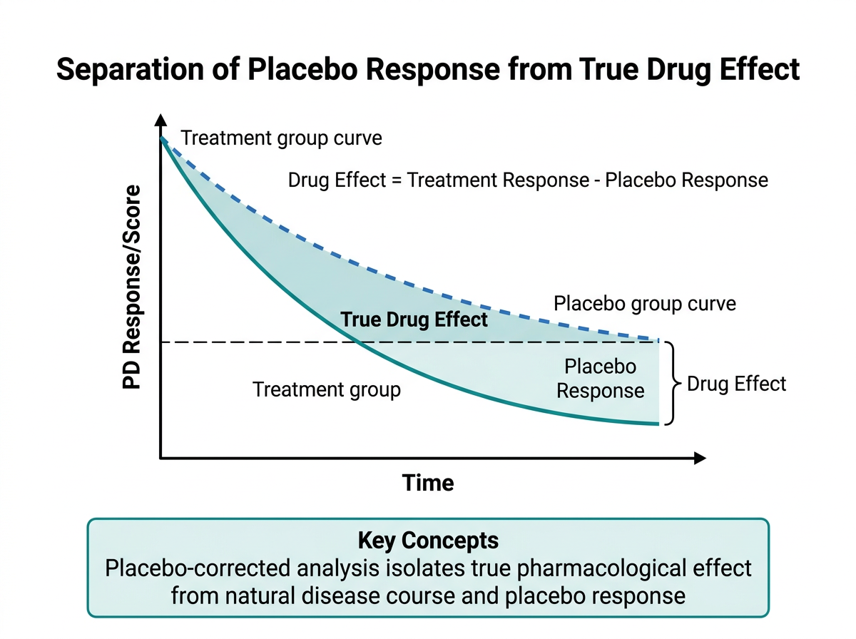 \[\text{Placebo-adjusted} = \text{Drug response} - \text{Placebo response}\]